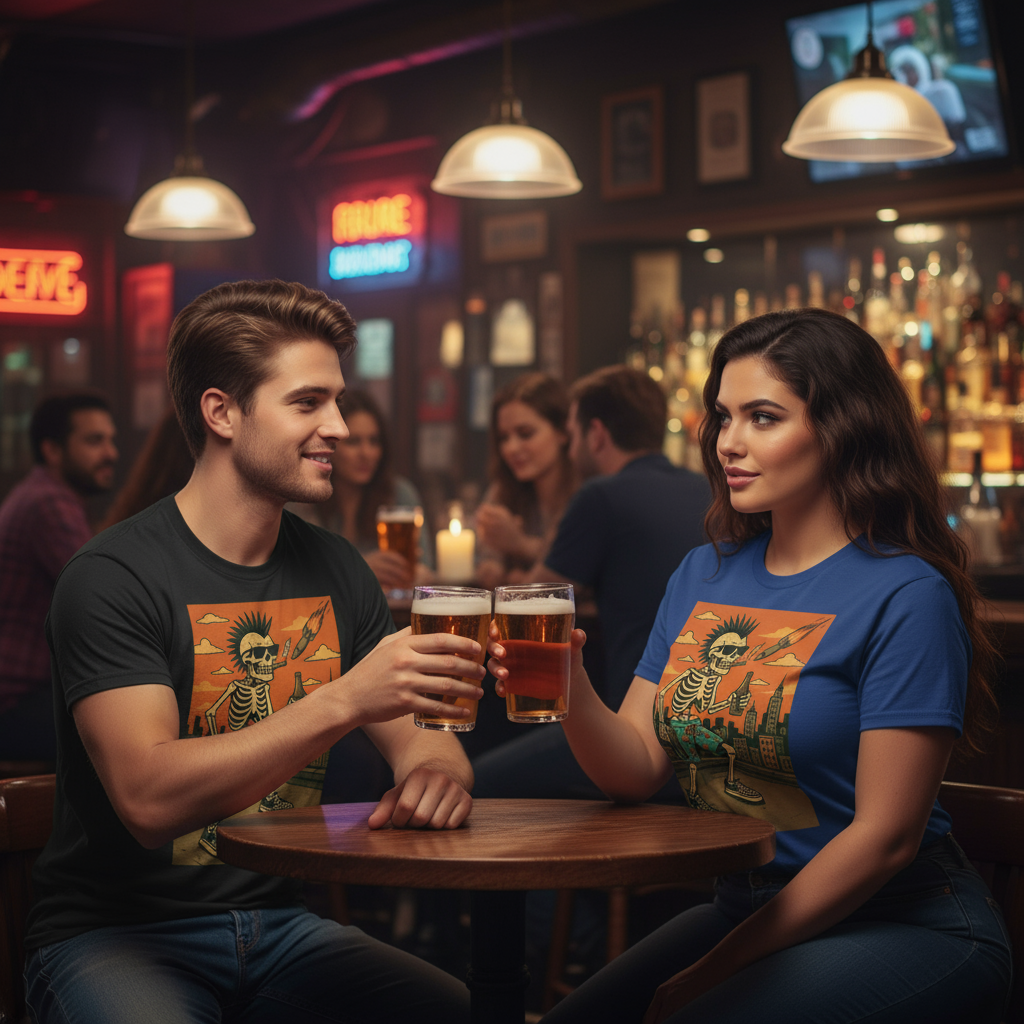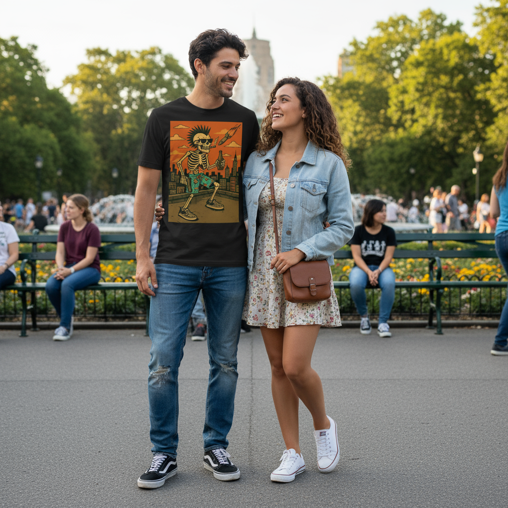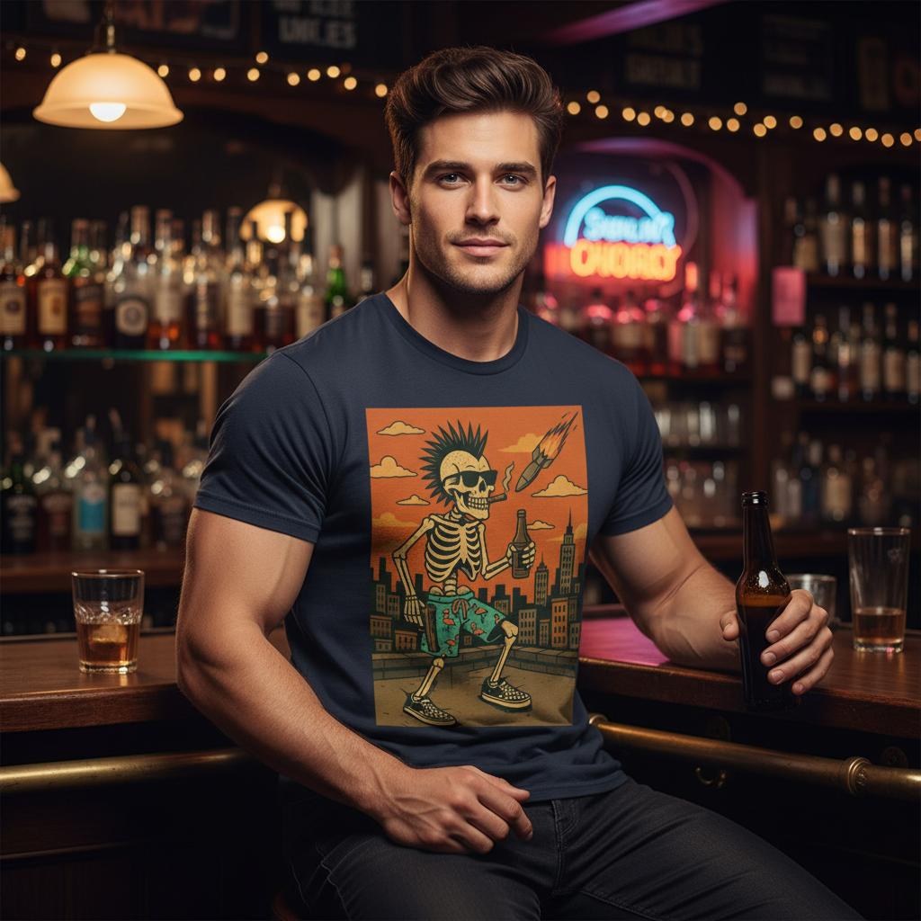 Some people follow rules. Some people write their own. This tee celebrates the eternal spirit of punk—raw, unapologetic, and forever young. Featuring a mohawk-sporting skeleton with checkered kicks owning the urban skyline, this design is a middle finger to conformity and a love letter to street culture. Crafted from premium 100% cotton with that structured fit punk rockers demand, this classic cut delivers sharp lines and rebellious comfort. The tubular fabric and double-seamed construction means it'll survive mosh pits, late nights, and whatever chaos you throw at it. Rock it with ripped jeans and combat boots, or dress it down with your favorite board shorts—this tee doesn't care about your rules.
